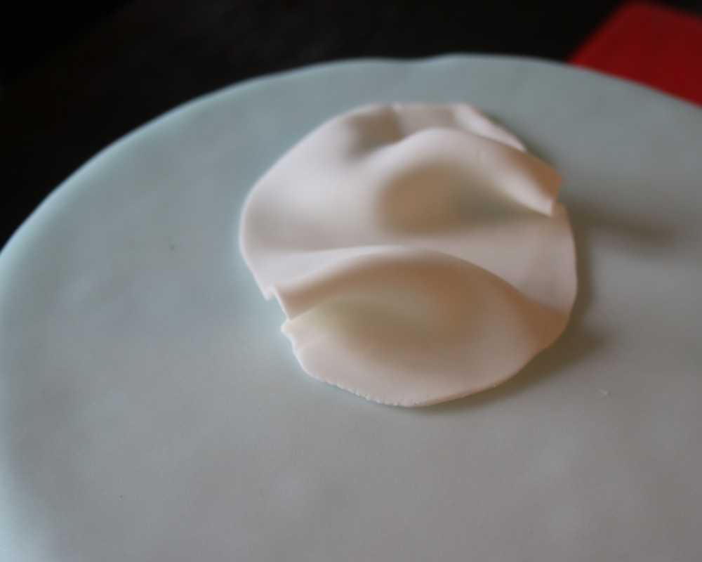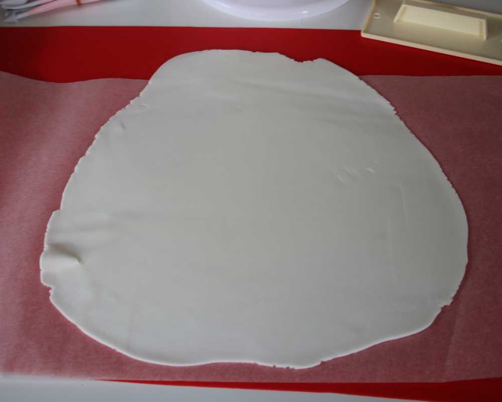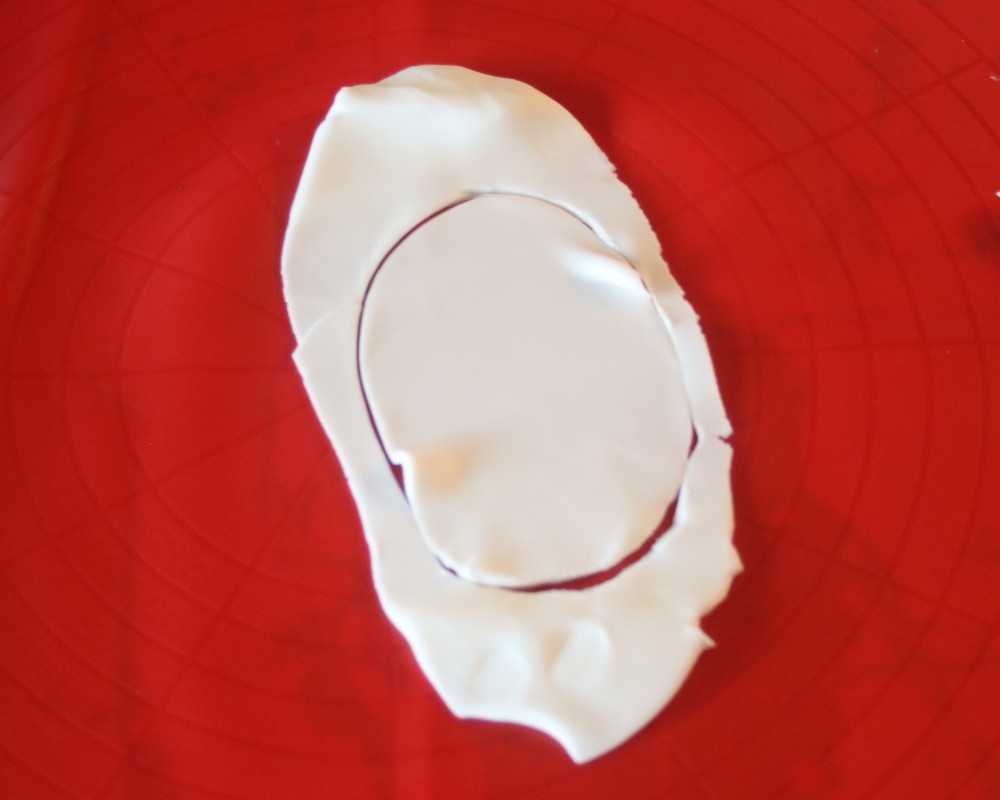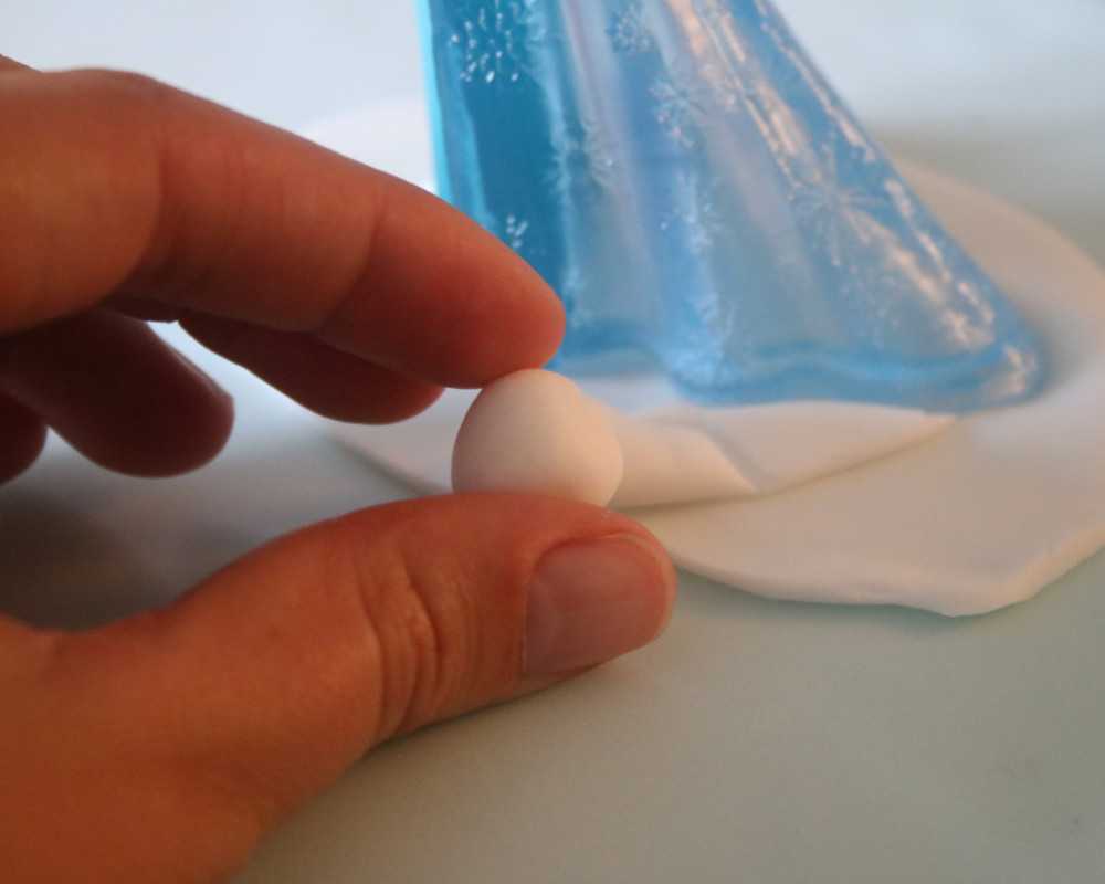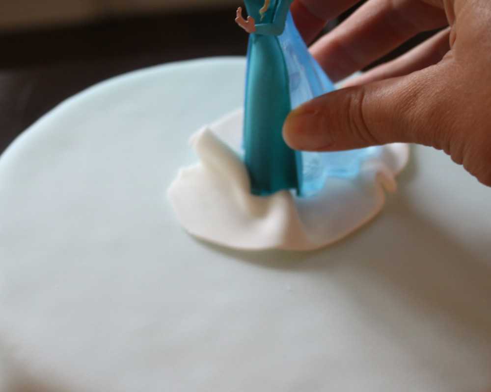 4 Rolle erneut weissen Fondant etwas dünner aus. Schneide eine ovale Form aus und drapiere sie so, dass der Fondant wie eine schöne Decke aufliegt. Darauf stellst du die Elsa-Figur.