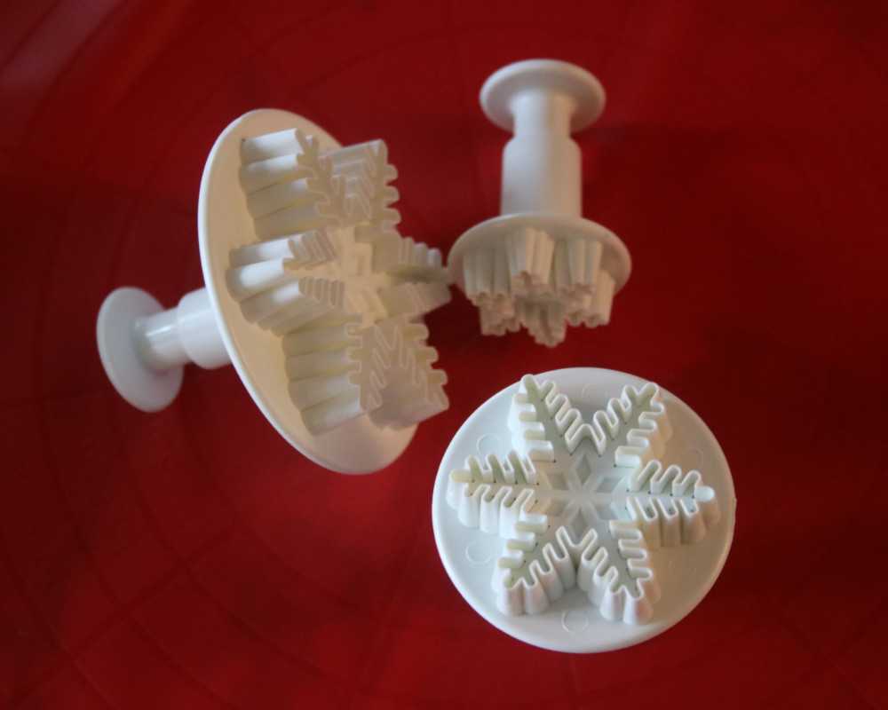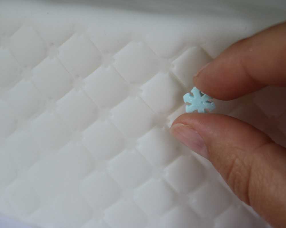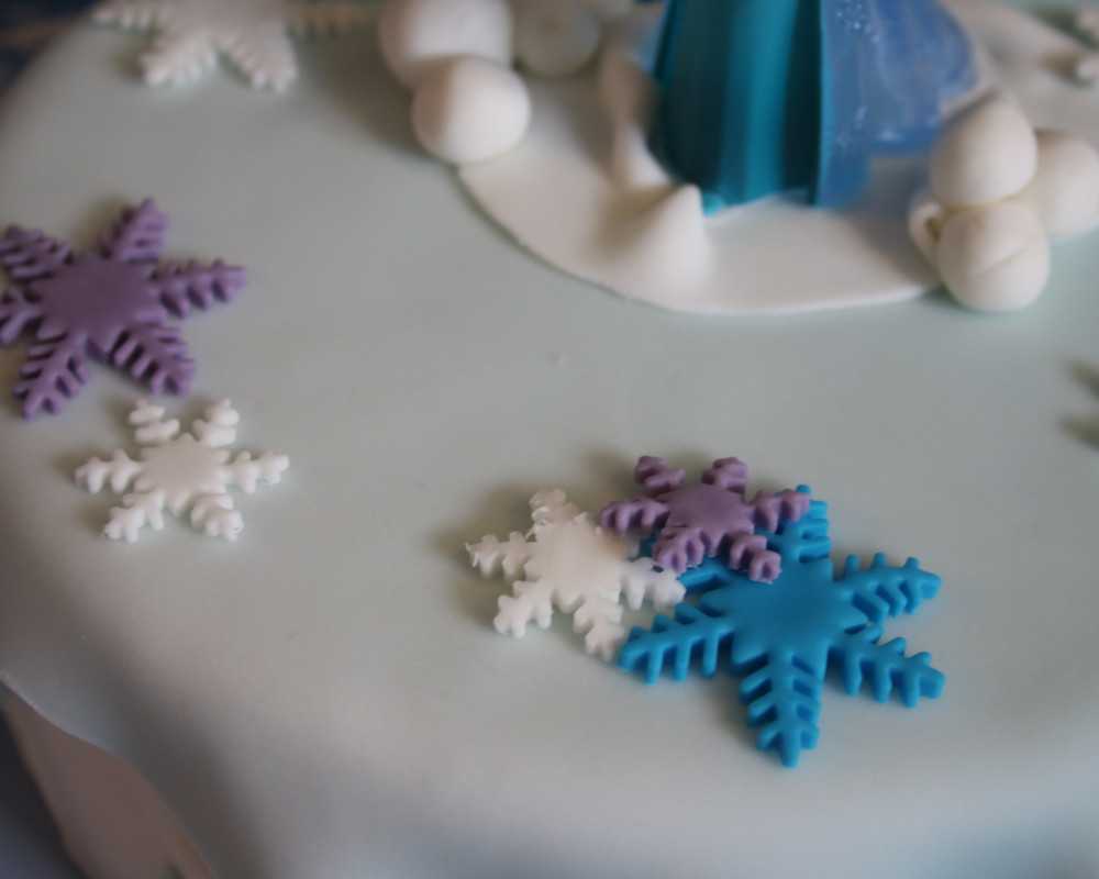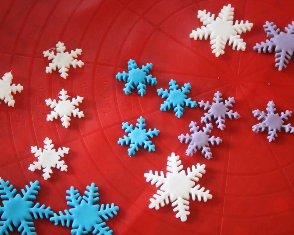 5 Nimm violetten, weissen und blauen Fondant und stich mit dem Schneeflocken-Ausstecher verschiedenfarbige Schneeflocken in unterschiedlichen Grössen aus. Mit diesen und einigen von Hand gerollten, weissen Kügelchen dekorierst du den Kuchen nach deinem Geschmack.