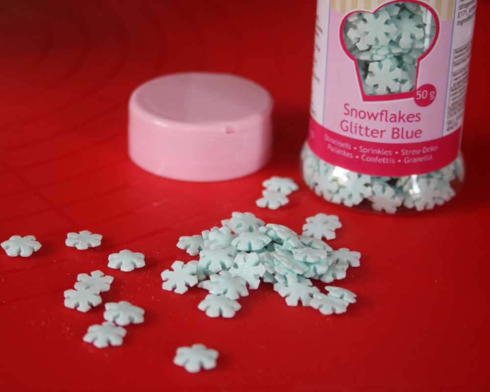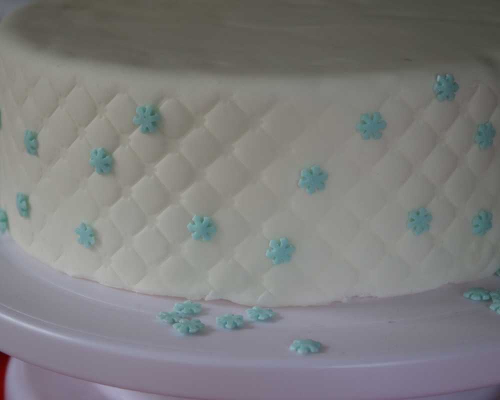 2 Forme mit Hilfe der Gitterform ein Quilting-Muster am Tortenrand und setze Schneeflocken-Streusel darauf.