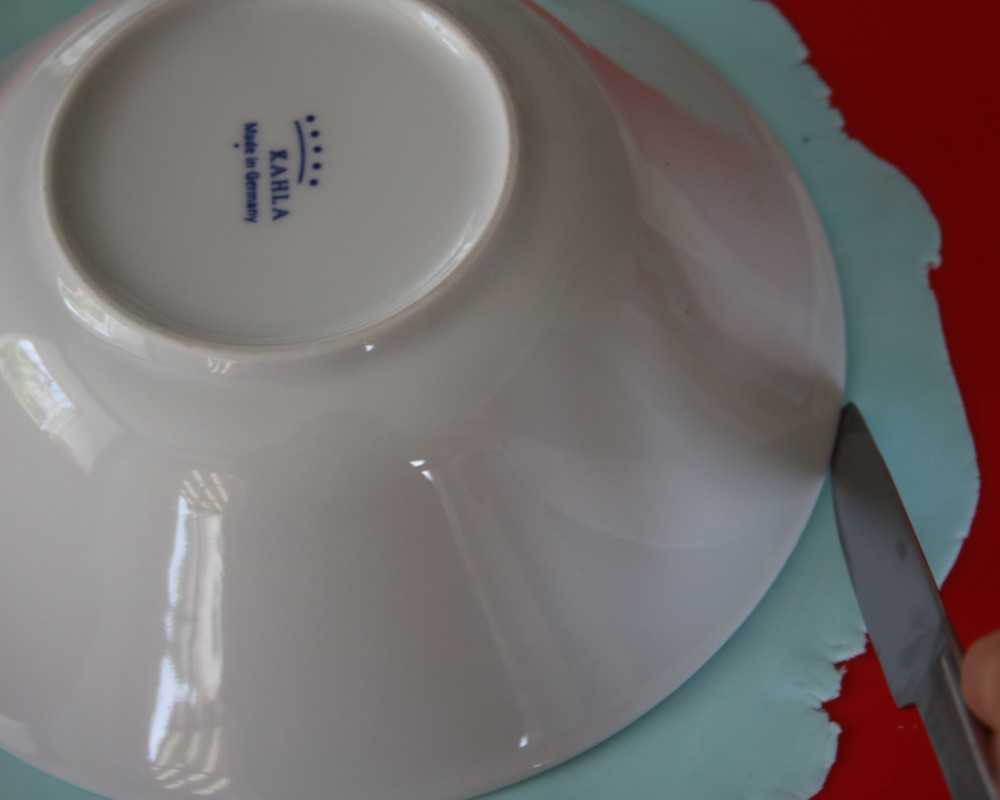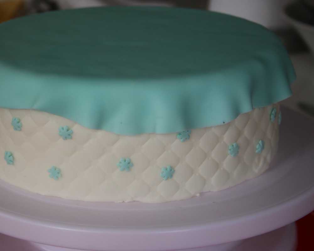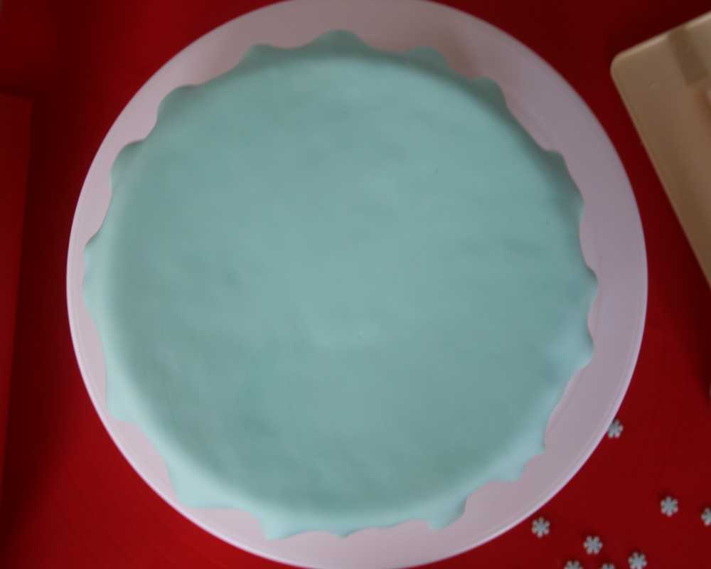 3 Rolle hellblauen Fondant aus und schneide einen Kreis aus der ca. 2 cm breiter ist als der Kuchendurchmesser. Drapiere ihn mittig auf dem Kuchen, sodass auf allen Seiten etwa gleich viel Fondant überhängt.
