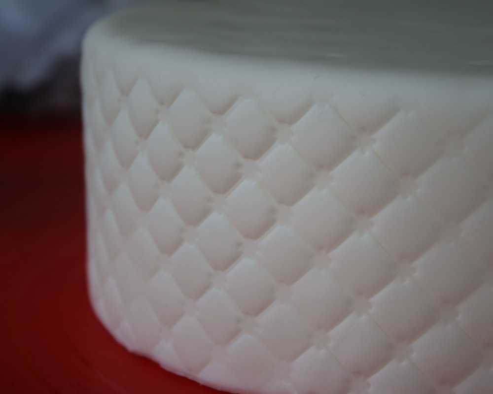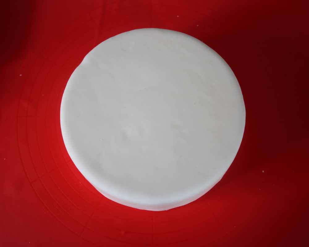 1 Rolle weissen Fondant aus und drapiere ihn auf der mit Ganache überzogenen Torte. Glätte ihn mit dem Glättewerkzeug und schneide die überstehende Masse ab.