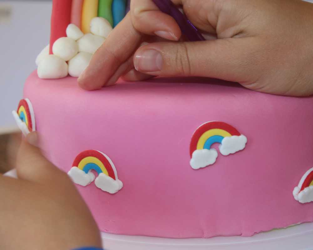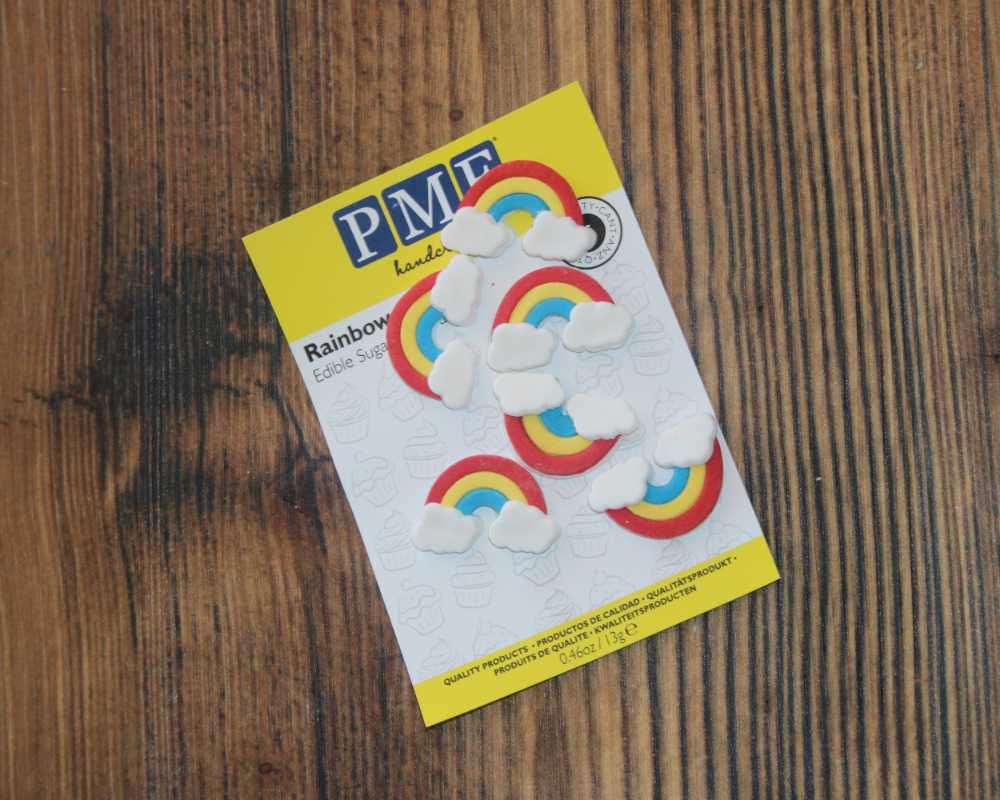 5 Klebe ausgestochene Wölkchen oder die Regenbogen Zuckerfiguren auf die Tortenseite. Schon ist die Torte servierfertig!