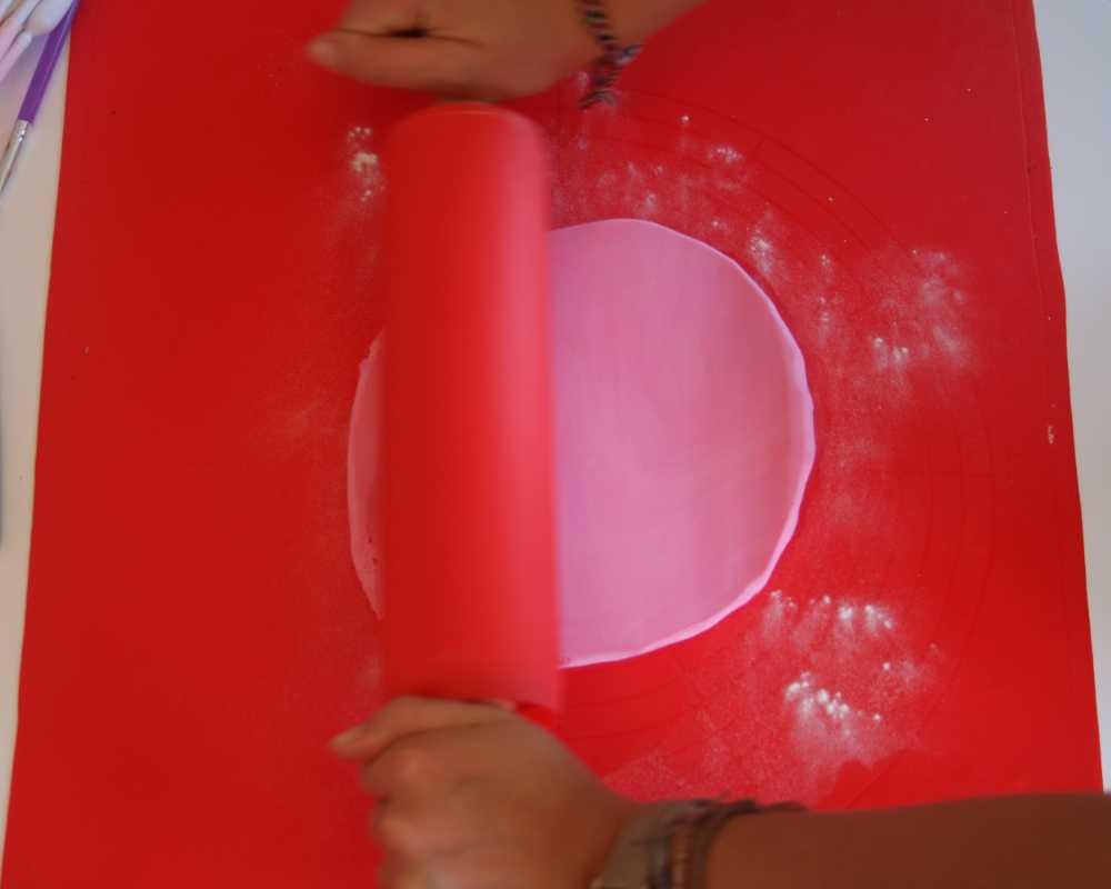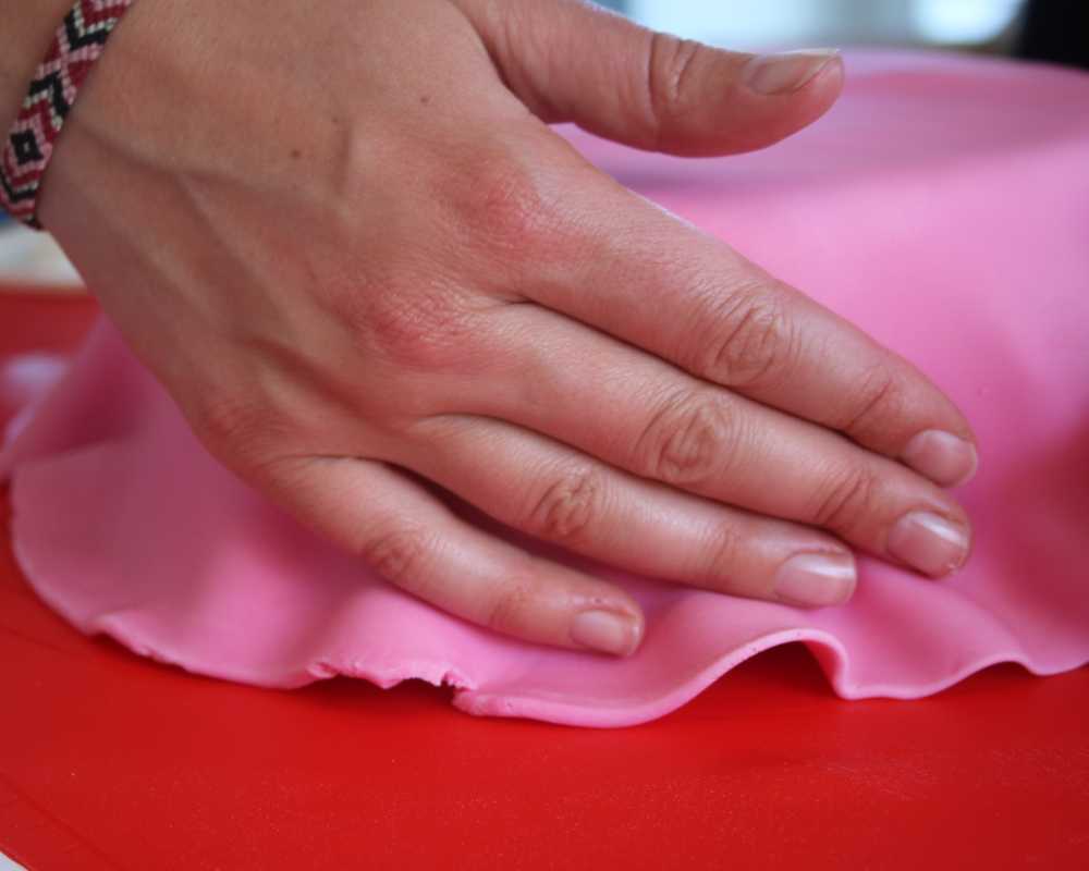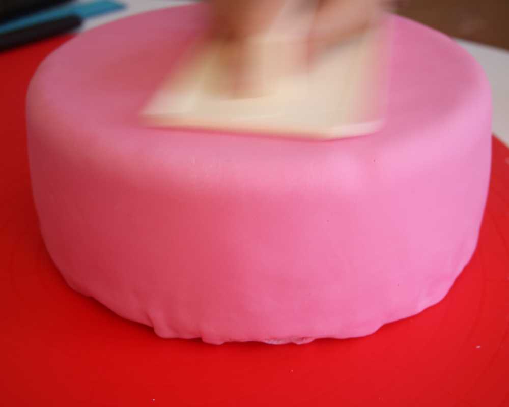 1 Rolle den rosa Fondant aus und drapiere ihn auf der mit Ganache überzogenen Torte. Glätte ihn mit dem Glättewerkzeug und schneide die überstehende Masse ab.