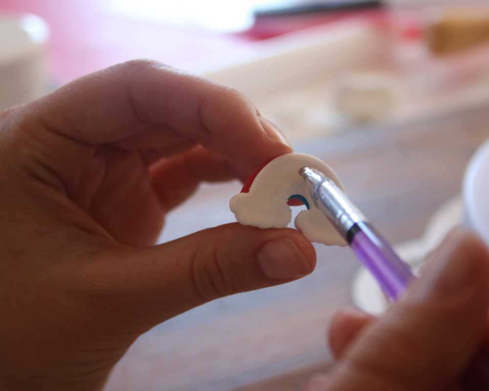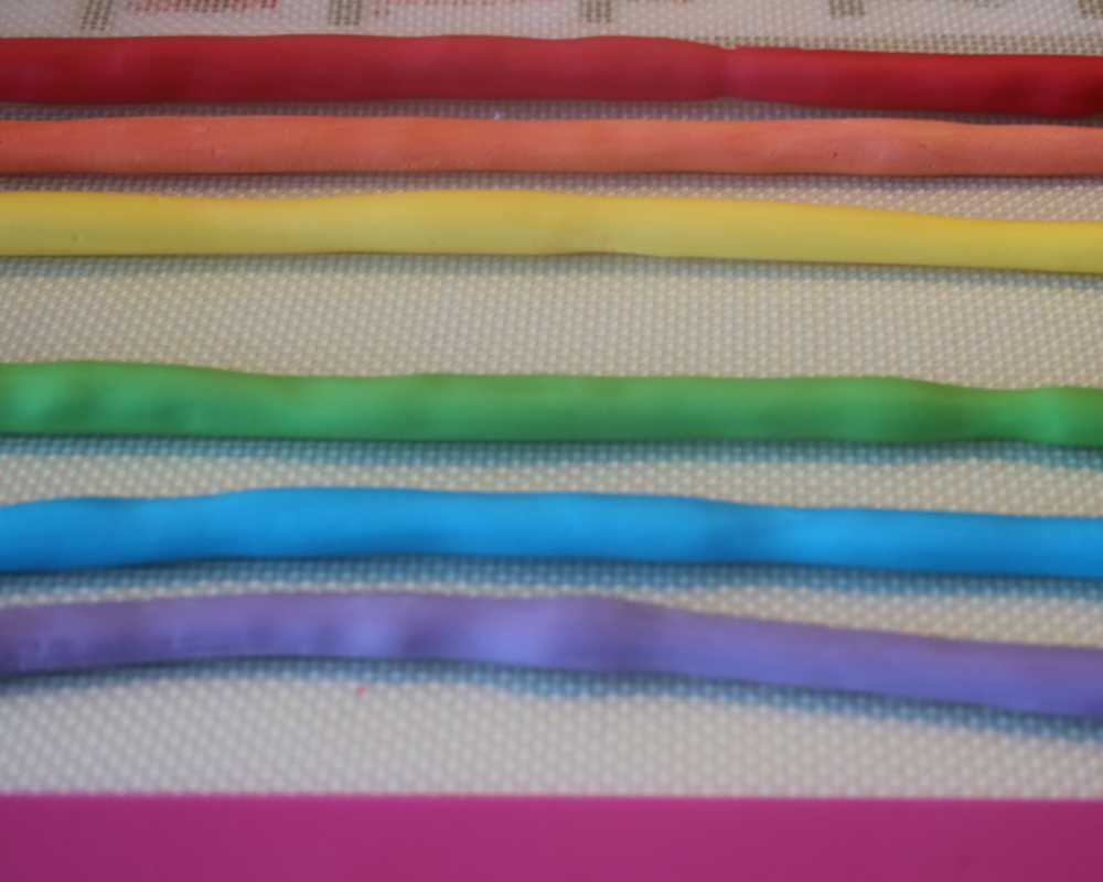3 Nimm den violetten, blauen, grünen, gelben, orangen und roten Fondant für den Regenbogen. Rolle jeweils von jeder Farbe ein genügend langes ca. 1 cm dickes Röllchen aus. Beuge zuerst das violette Röllchen zu einem schönen Bogen. Klebe dann die weiteren Farben jeweils oben an. Schneide die abstehenden Reste gerade ab. Lege den Regenbogen zur Seite, damit er ein bisschen trocknen kann.