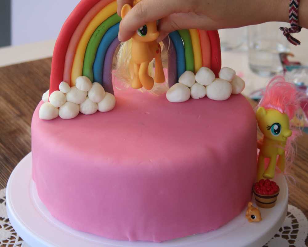 4 Stecke (falls notwendig) Zahnstocher unten in den Regenbogen, um ihn auf der Torte aufzustellen. Mit weissen Fondant-Kügelchen kannst du an den Enden des Regenbogens Wolken anbringen. Stelle die My Little Pony Figur unter den Regenbogen.