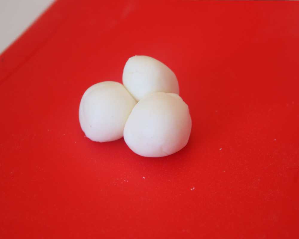 2 Forme mit Hilfe des Perlen-Modelierförmchens aus weissem Fondant Perlenreihen oder rolle von Hand kleine Kügelchen. Befestige diese am unteren Kuchenrand.
