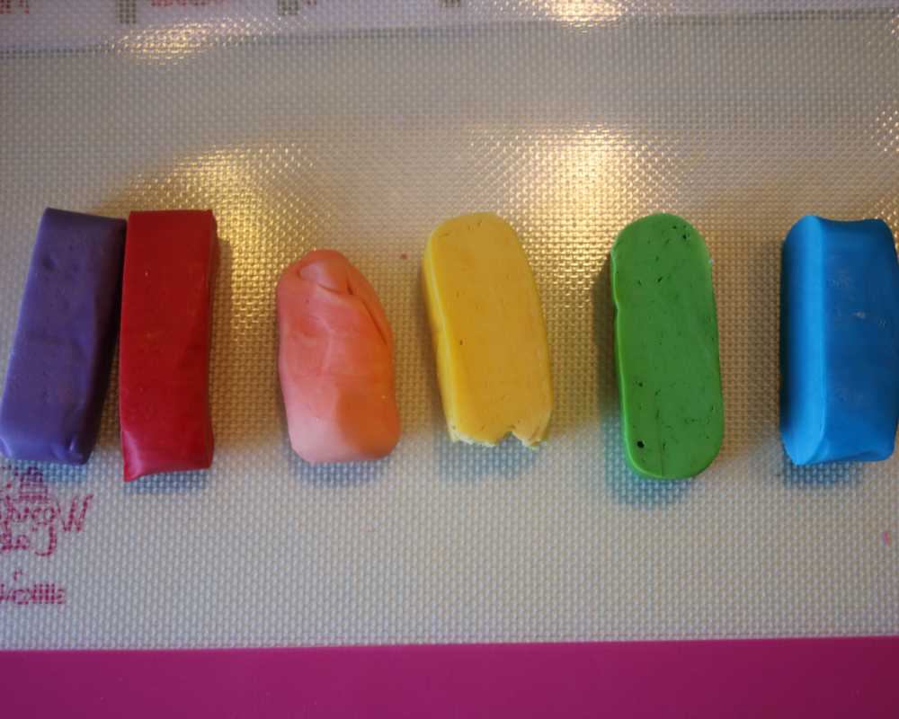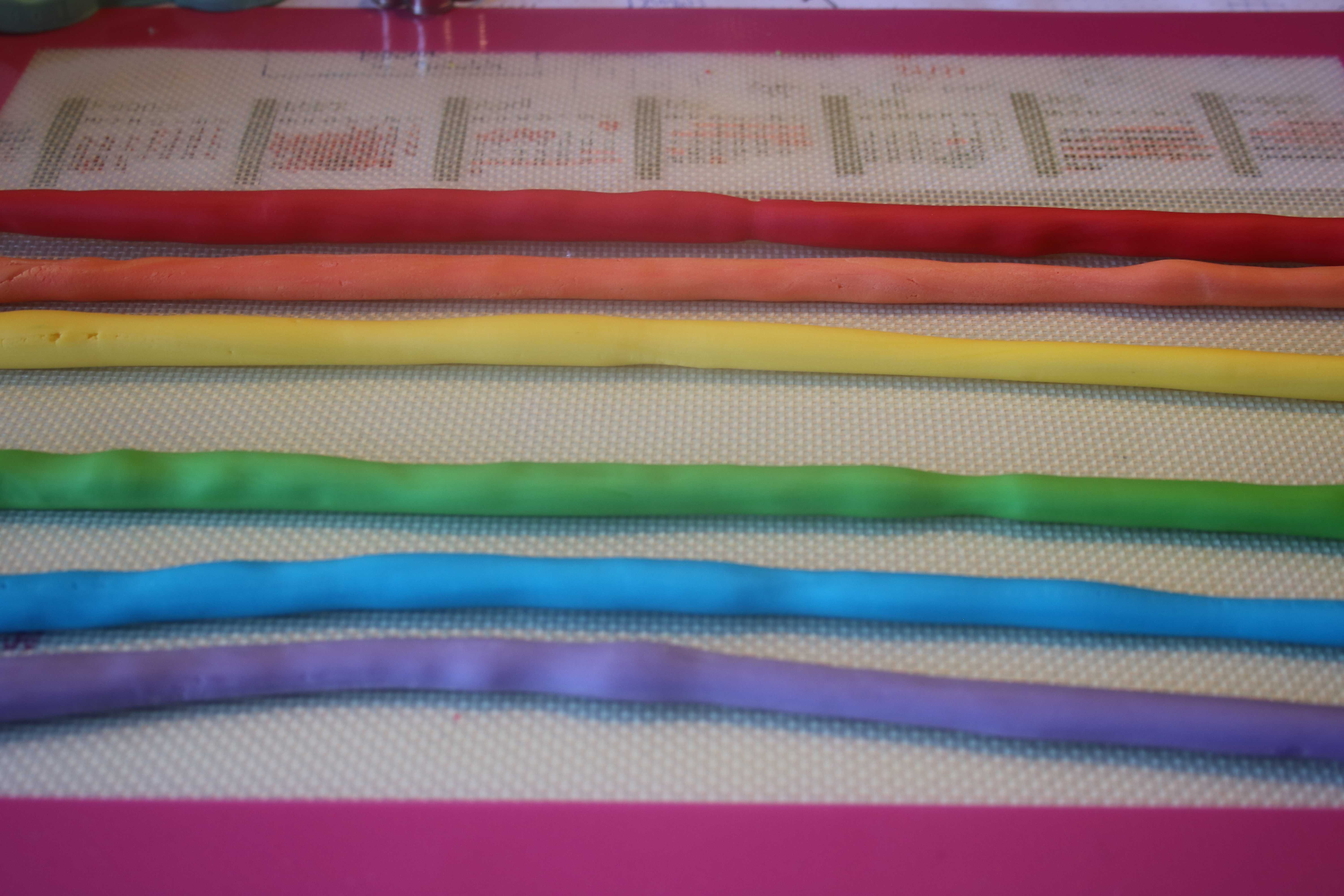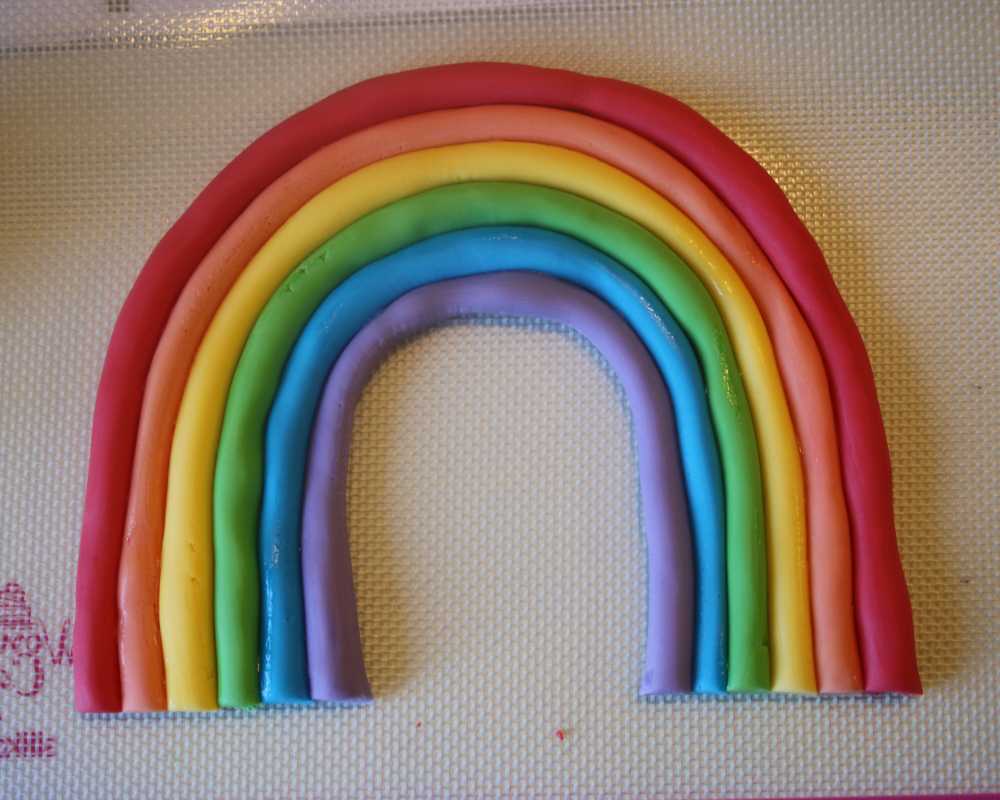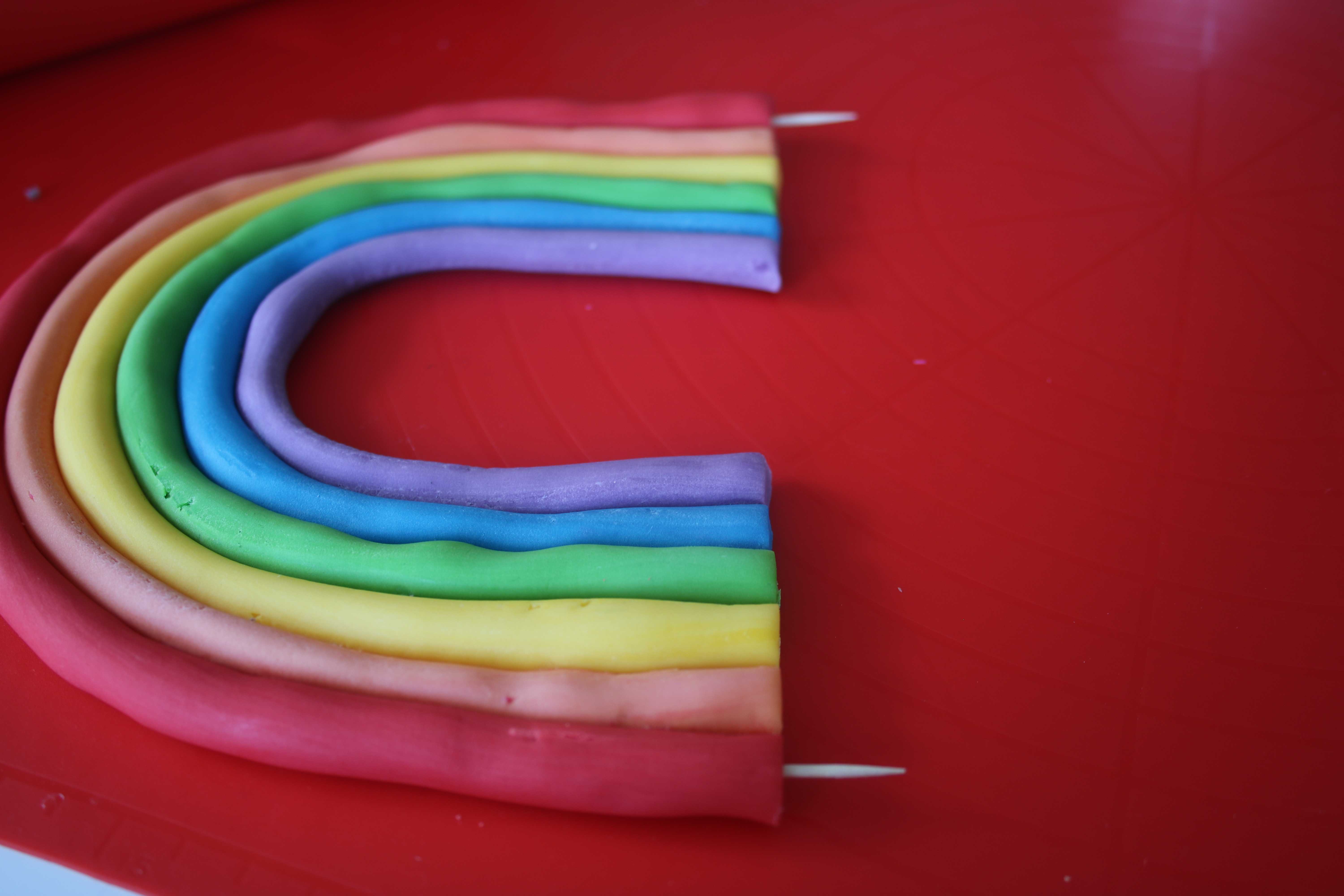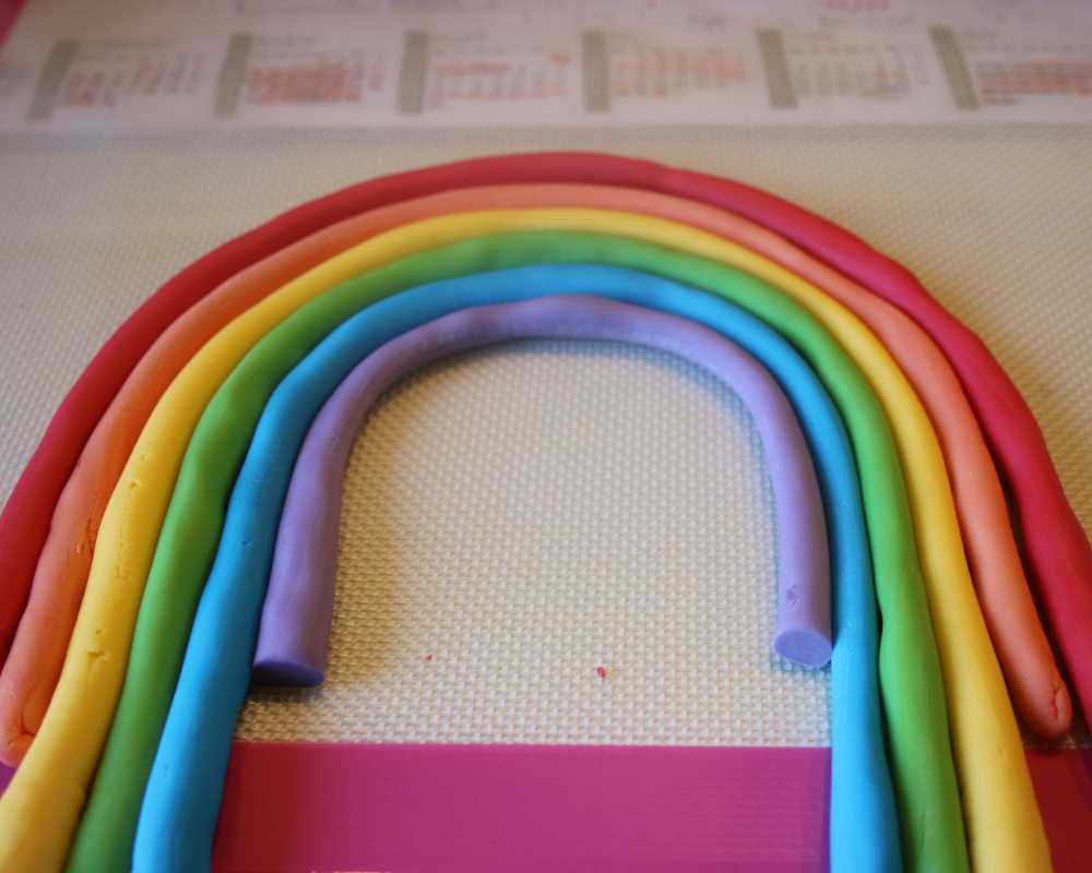 2 Nimm den violetten, blauen, grünen, gelben, orangen und roten Fondant für den Regenbogen. Rolle jeweils von jeder Farbe eine ca. 1 cm dicke Schlange aus, die so lang wie der Durchmesser der Torte ist. Beuge zuerst das violette Röllchen zu einem schönen Bogen. Klebe dann die weiteren Farben jeweils oben an. Schneide die abstehenden Reste gerade ab. Lege den Regenbogen zur Seite, damit er ein bisschen aushärten kann.