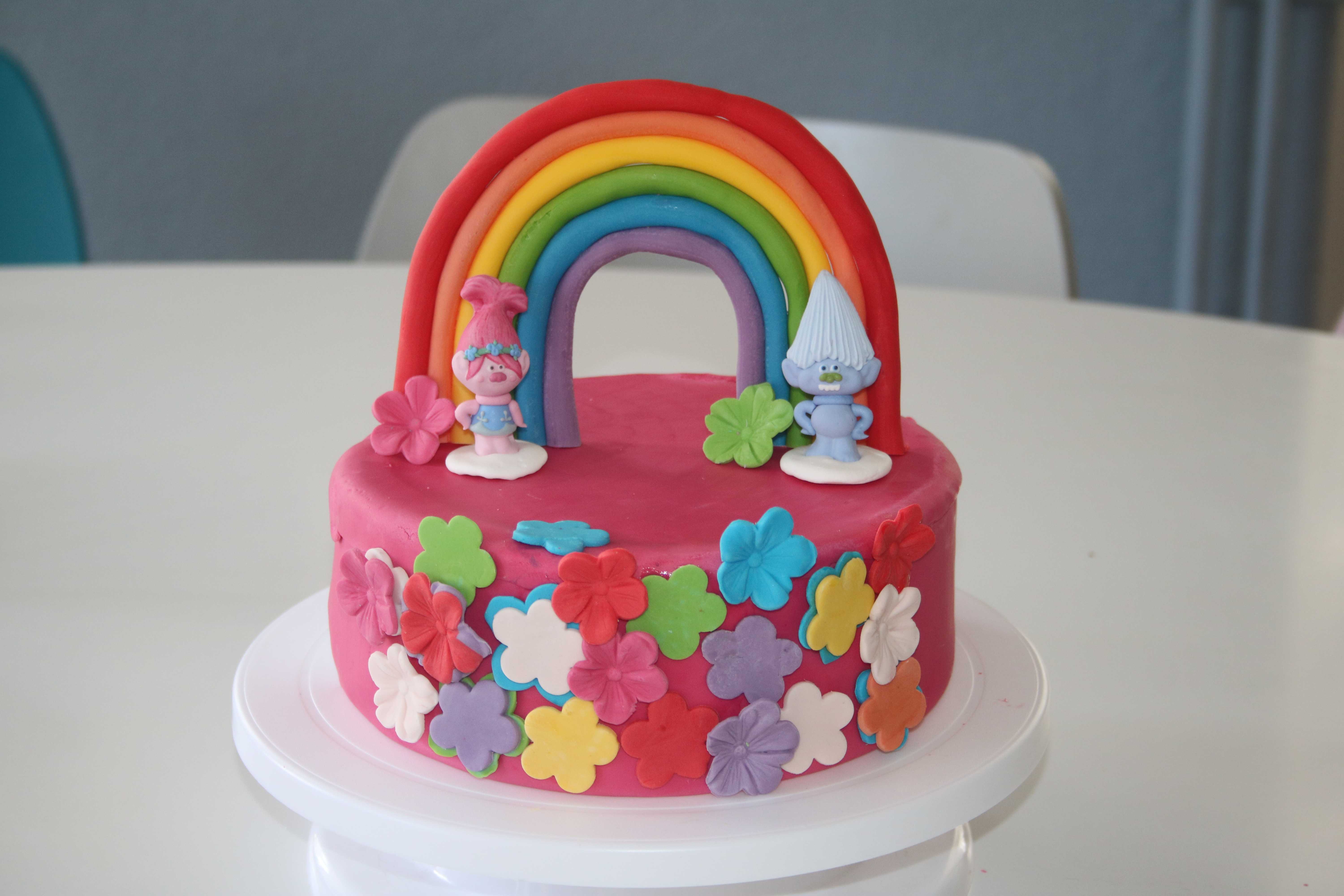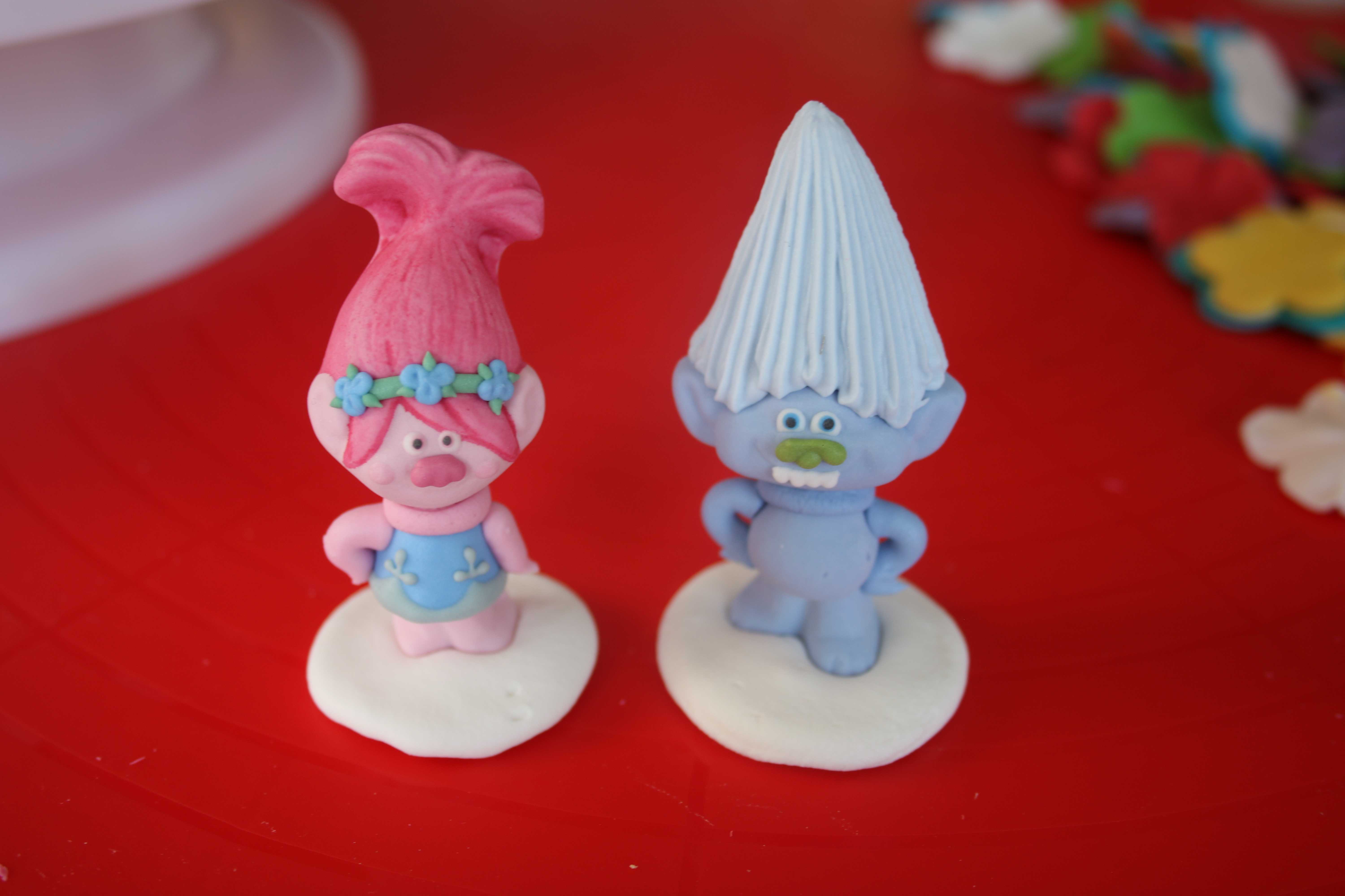 4 Stecke (falls notwendig) Zahnstocher unten in den Regenbogen, um ihn auf der Torte aufzustellen. Platziere dann die Zuckerfiguren von Poppy und Branch seitlich davor. Fertig ist deine Trolls-Torte!