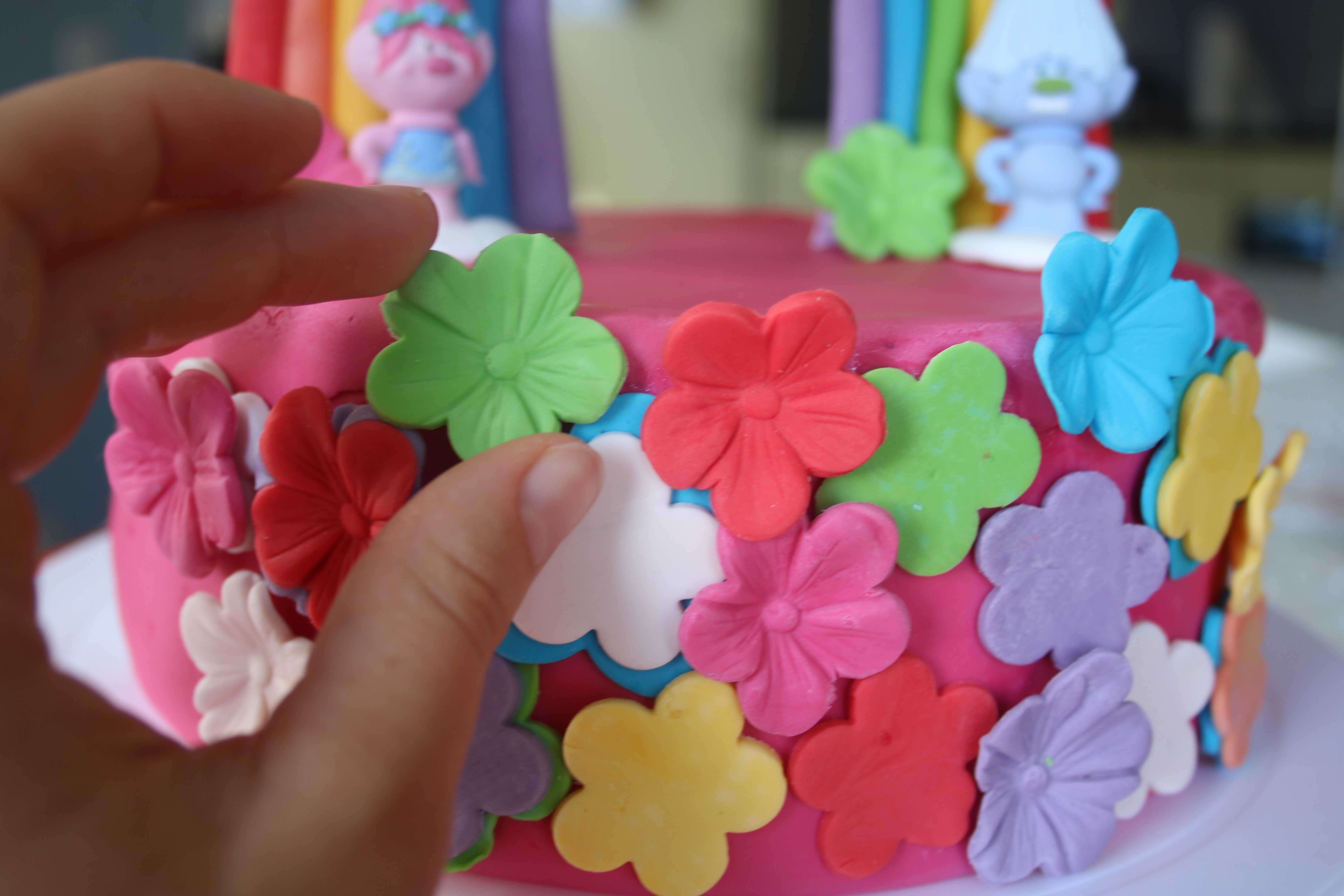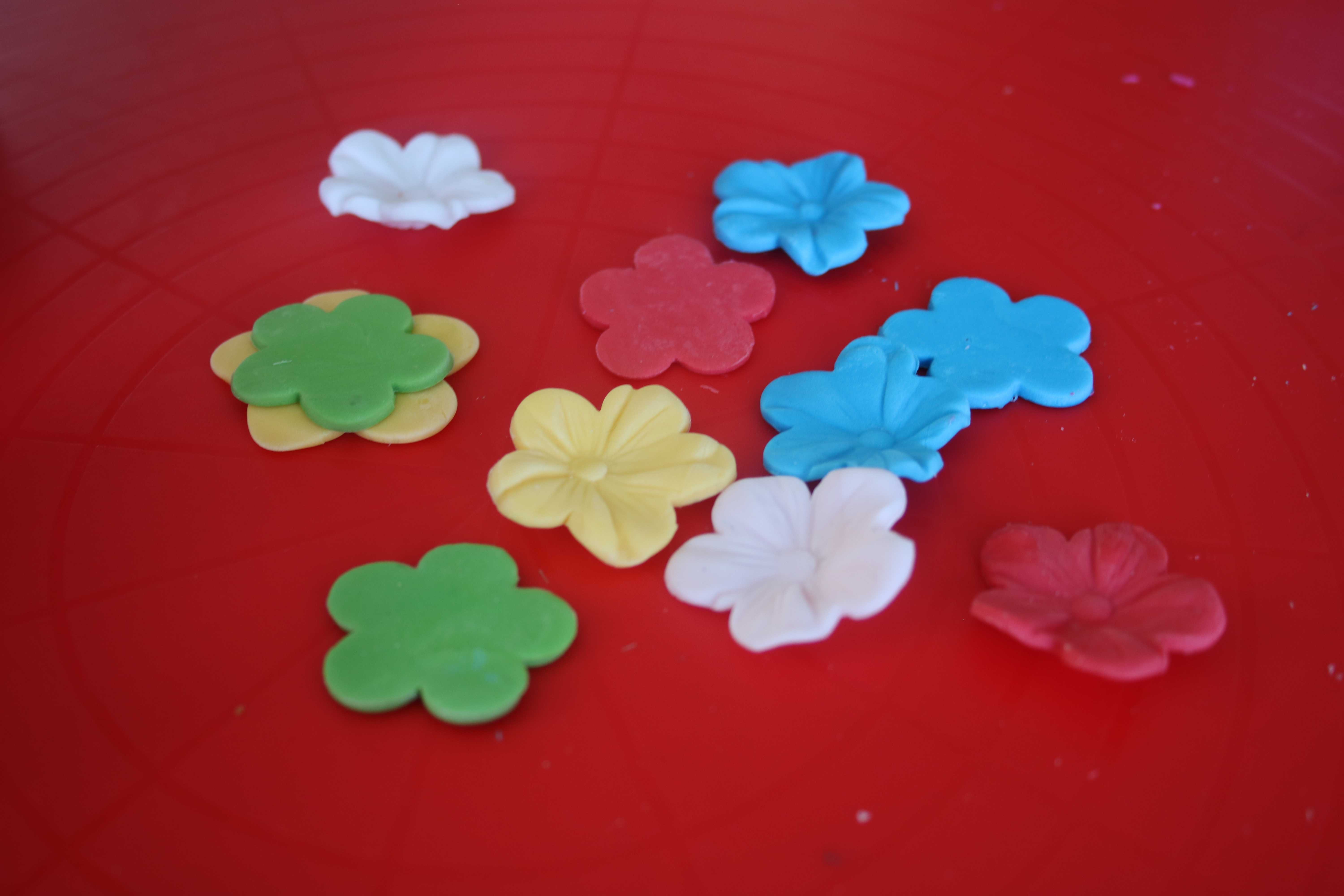3 Rolle nun Fondant in beliebigen Farben aus und steche mit den Blumenausstechern verschiedene Grössen aus. Klebe sie ganz nach deinem Geschmack übereinander und befestige die Blumen seitlich und oben auf der Torte.