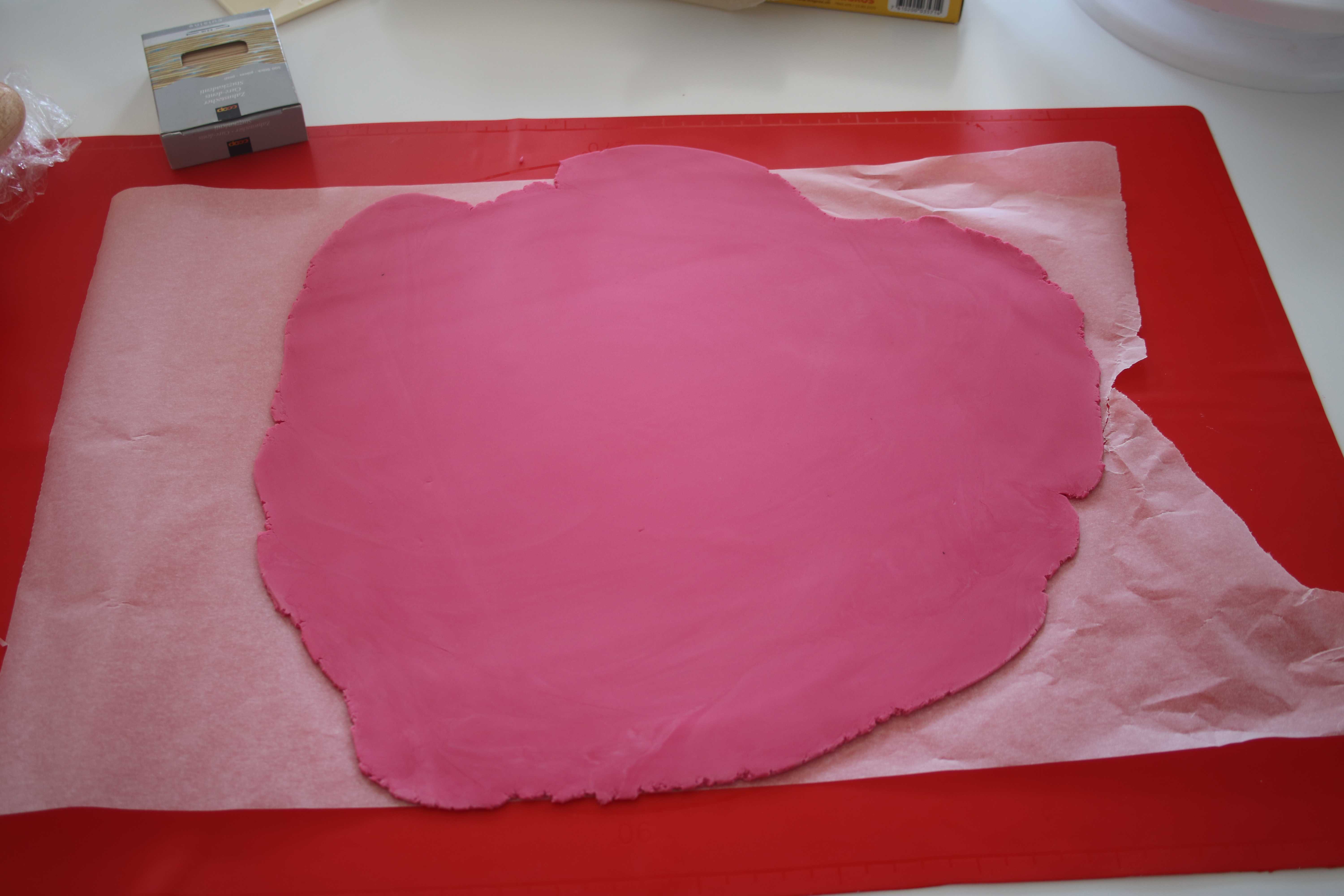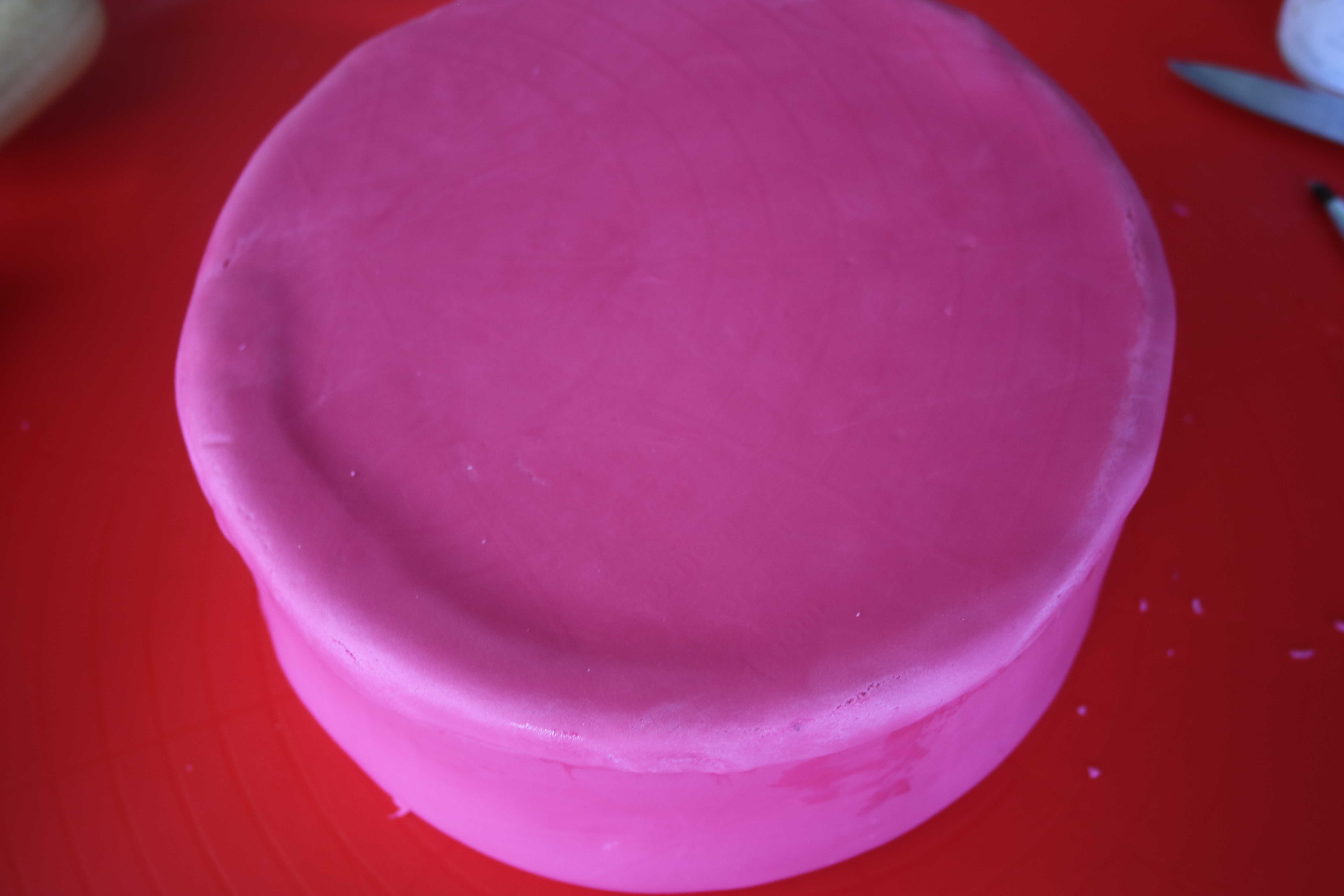 1 Rolle den pinken Fondant aus und drapiere ihn auf der mit Ganache überzogenen Torte. Glätte ihn mit dem Glättewerkzeug und schneide die überstehende Masse ab.