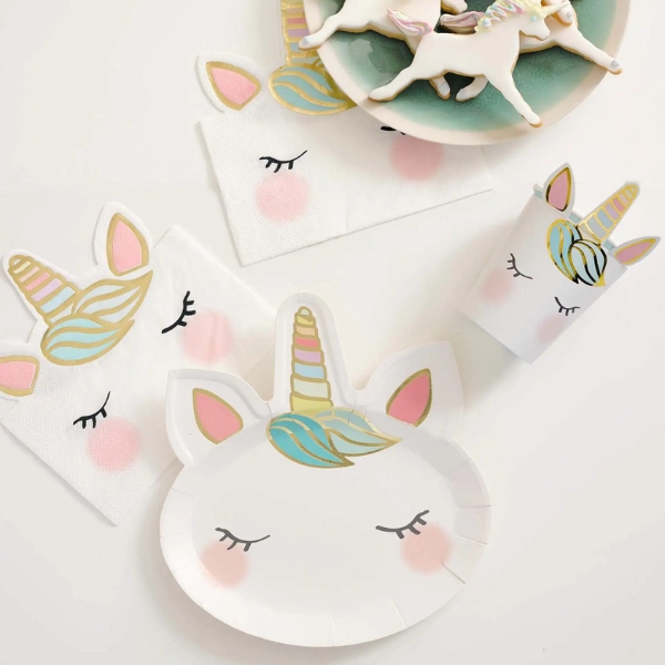 Die Teller Einhorn Gesicht verleihen der Tischdeko den letzten Schliff.