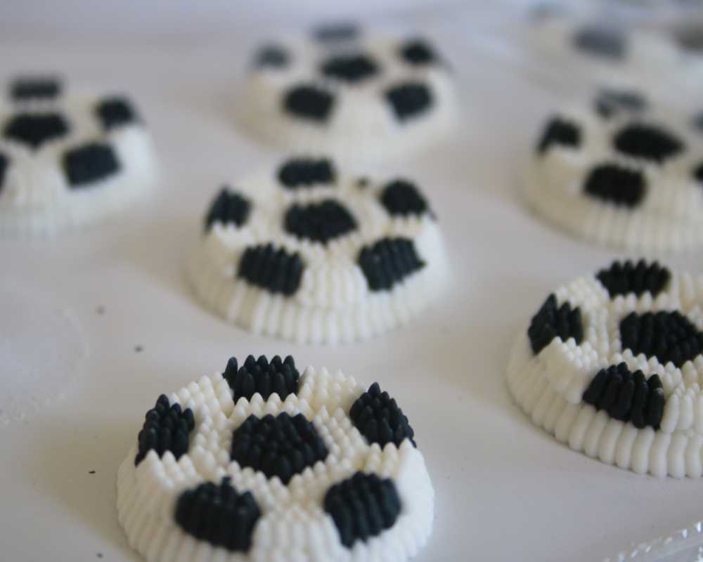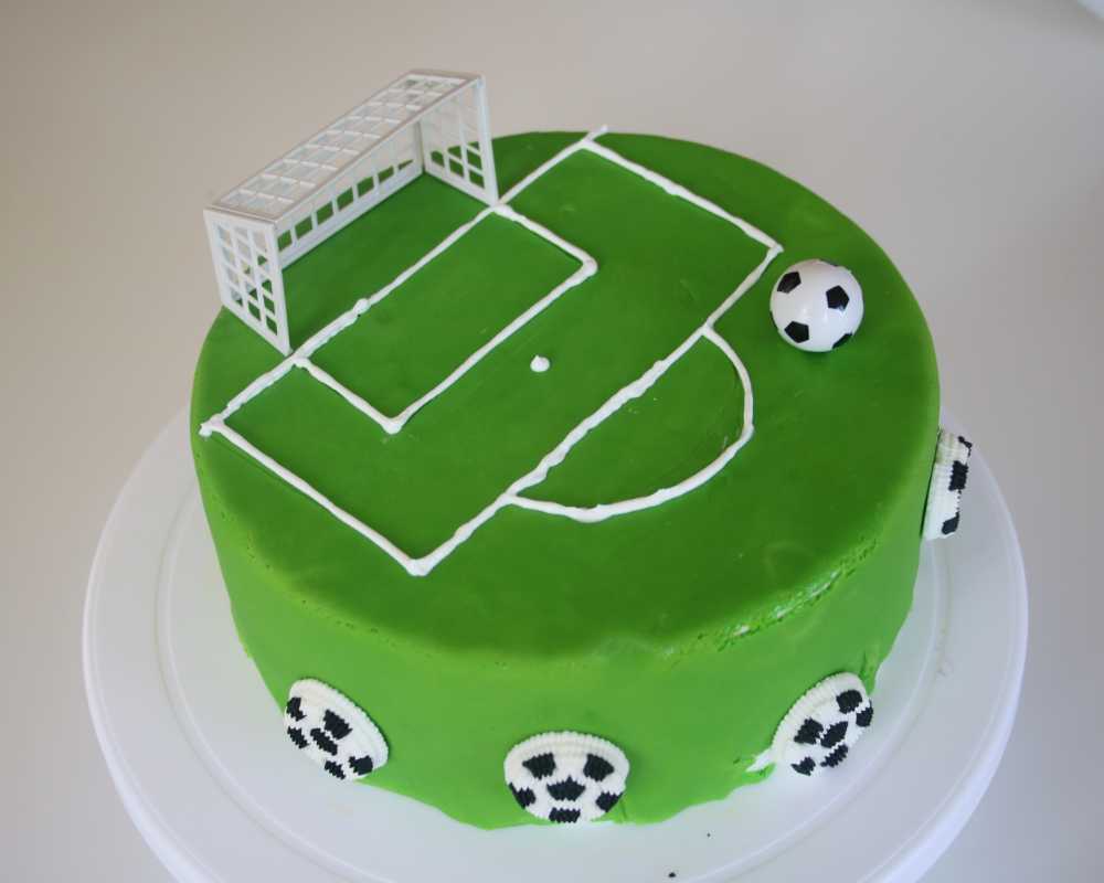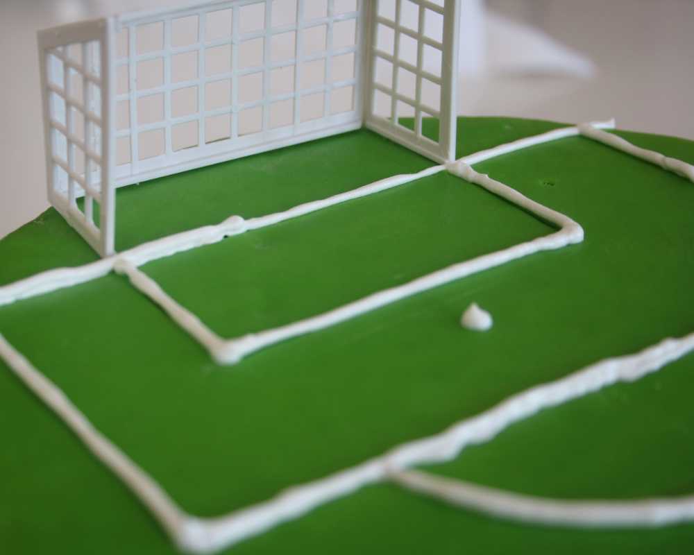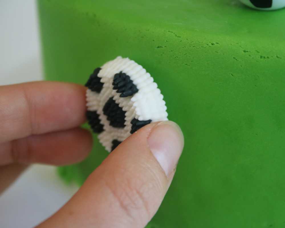 3 Place les autres figurines du set de décoration de but de football sur le gâteau et colle la décoration en sucre du football sur le côté avec un peu d'eau ou de colle comestible.