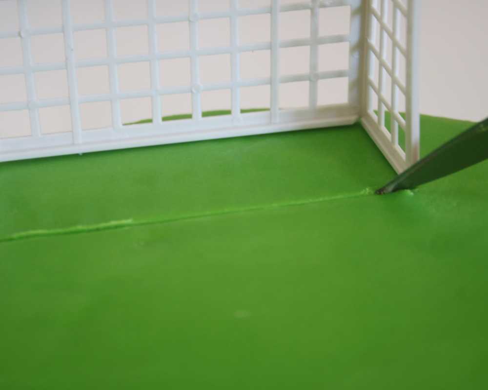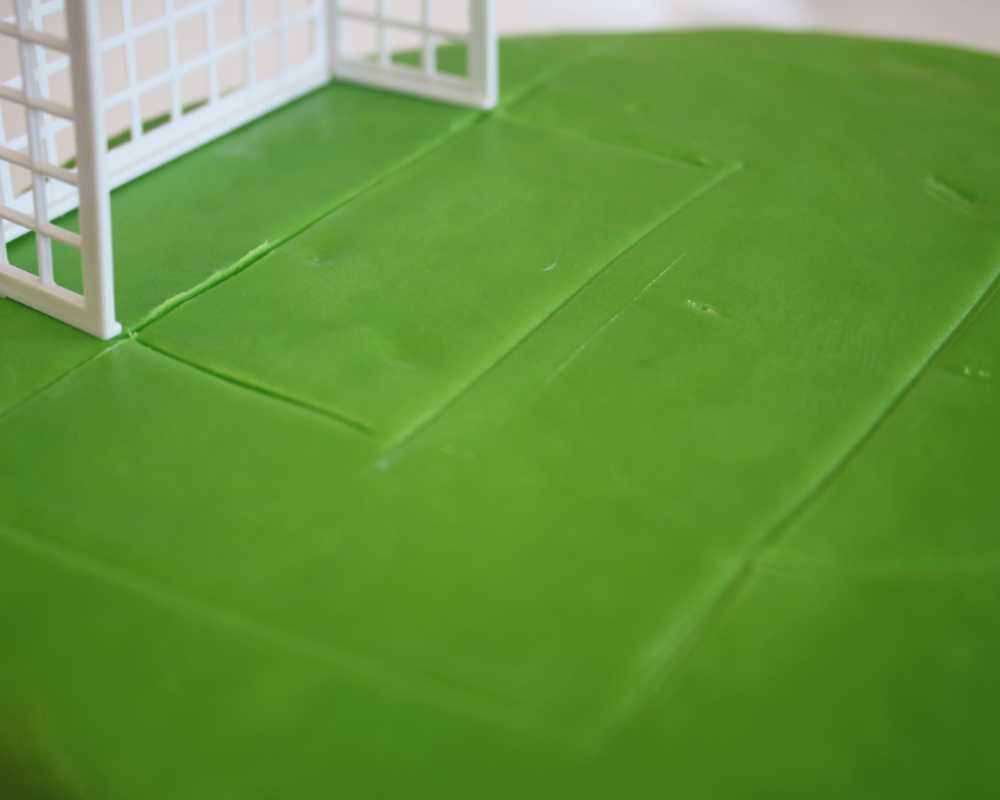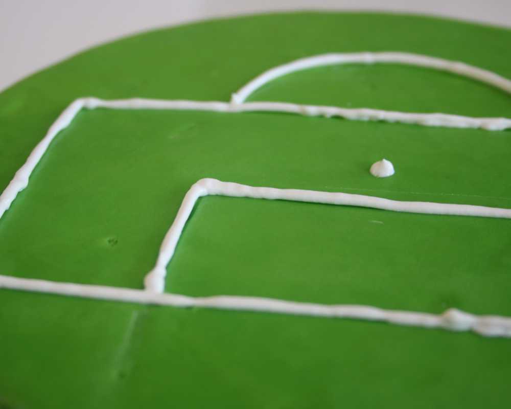 2 Place d'abord les buts de ton set de décoration de gâteau sur le gâteau afin de connaître la taille de ton terrain de football. Dessine ensuite les lignes du terrain de football avec un outil de modelage ou un couteau. Tu peux maintenant tracer les lignes avec du sucre blanc. Pour que les lignes soient bien droites, tu peux aussi utiliser une règle.