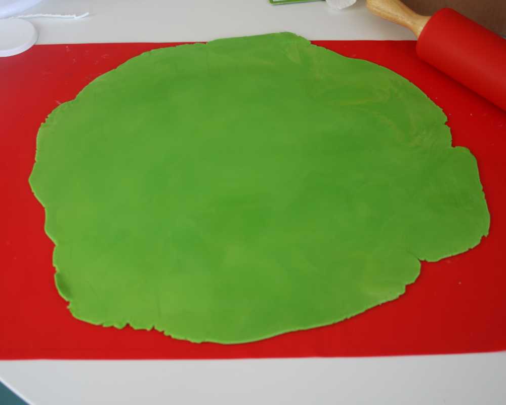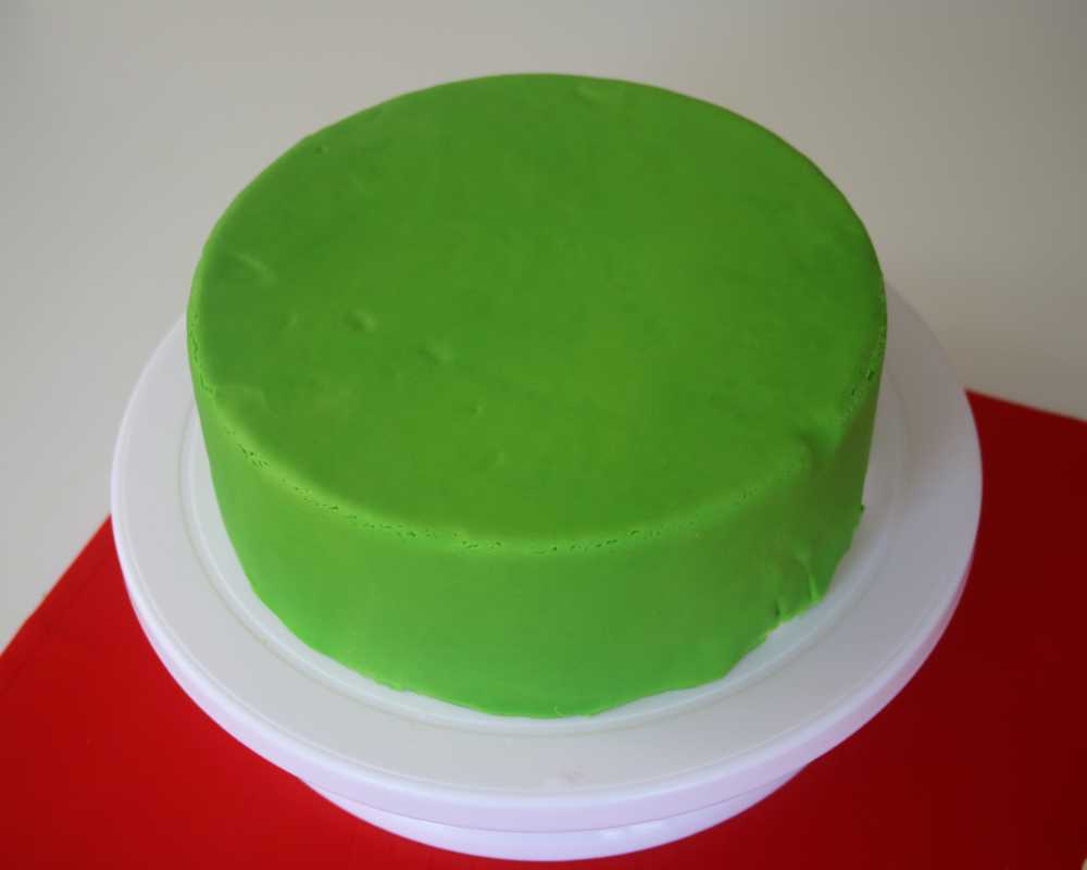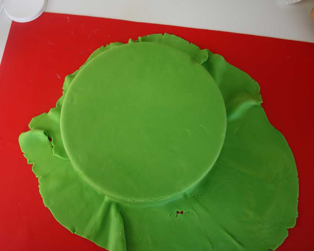 1 Dérouler le fondant vert et le draper sur le gâteau recouvert de ganache. Lisse-le avec l'outil de lissage et coupe l'excédent de masse.